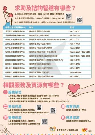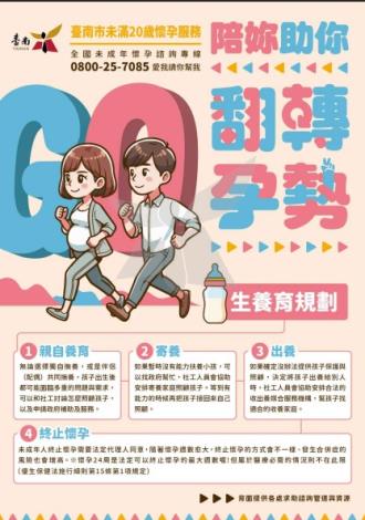 衛生福利部社會及家庭署設置「未成年 懷孕求助網站」(https://257085.sfaa.gov.tw/)未成 年懷孕諮詢專線(0800-25-7085)「陪 妳、助你-翻轉孕勢」宣導單張提供遭遇困境未成年懷孕 少女、家屬及其重要他人近便性、即時性諮詢管道。